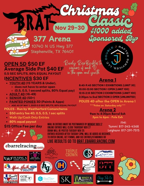 Please join us November 29-30 at 377 Arena in Stephenville for our annual Christmas Classic race! Please check out and thank our title sponsor – DOUBLE J RAFTER SERVICES, LLC at djrsllc.com and see what all they can do for you. Rowdy Rose Buckles will be awarded to winners in each D in the Youth and Open both days.
