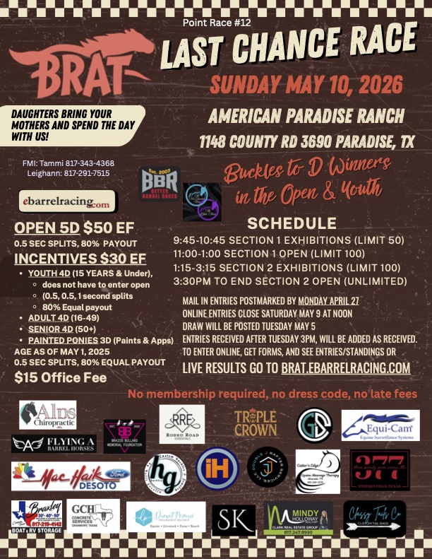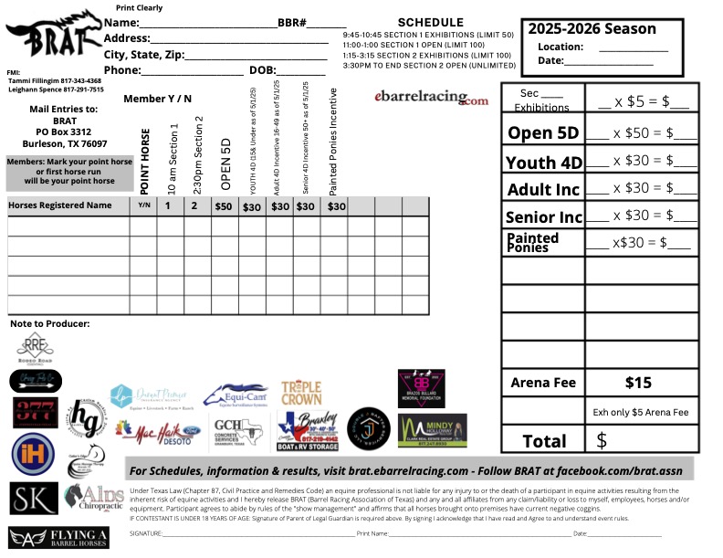 BRAT loves vendors! If you need vendor information please contact Tammi 817-343-4368. Vendor Sponsor Application BRAT so appreciates our sponsors for this upcoming season. If you see these guys let them know how much we appreciate it! BRAT is always looking for new sponsors! We’d love to hang your banner, announce you at races, facebook recognition…..etc. Contact us if you or your business has any interest. BRAT directors (817)343-4368 or (817)291-7515FMI please call Tammi at (817)343-4368